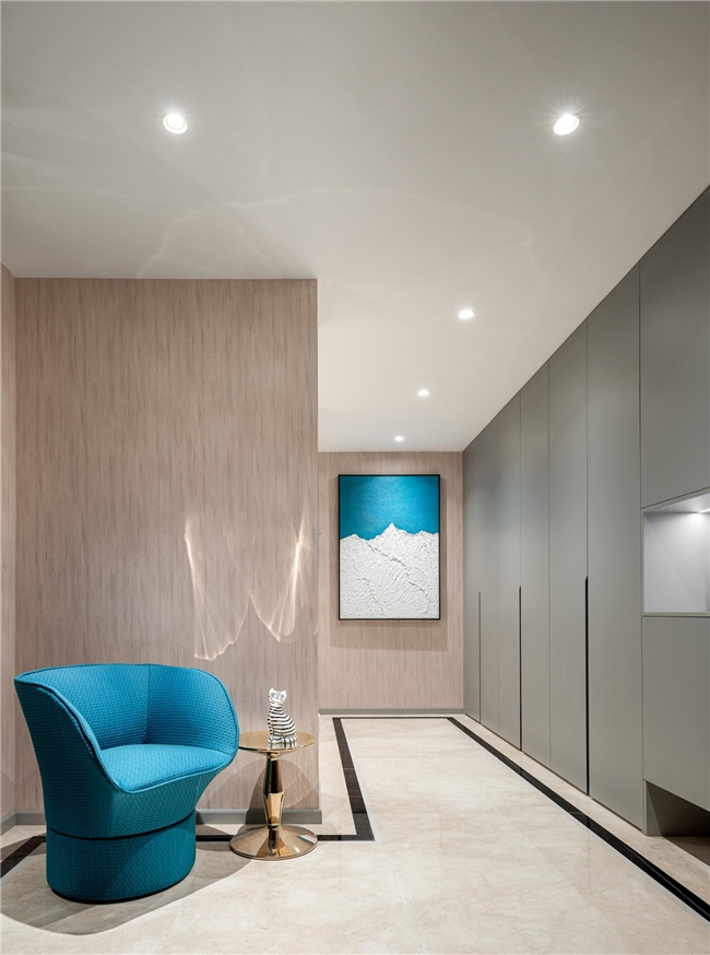 入户玄关处,艺术画作与单人沙发色彩相互呼应,营造出写意悠然的氛围。雅致灰色收纳柜,通过上下留空的独特设计,构建出虚实相生的通透感,恰似电影场景般生动。