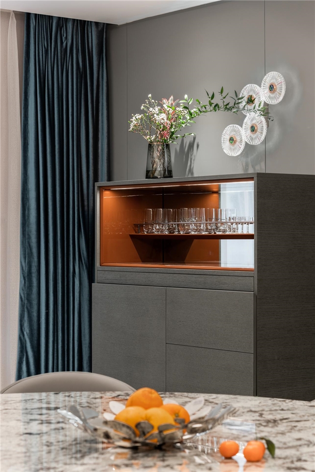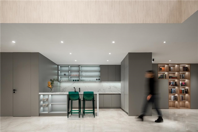 餐边柜上方的功能景观,在光影的细腻铺陈下,于低饱和度的整体观感中呈现出自然的意趣,层次感与质感跃然眼前。细节之处,皆是对生活的深情馈赠,艺术与生活的界限在此处悄然模糊,共同编织出动人的生活图景。 周末傍晚,居者一家围坐在开放式社交厨房的餐桌旁。柔和灯光倾洒在岩板岛台上,与家人一同准备晚餐,欢声笑语在空间里回荡。西班牙老矿大理石的餐桌承载着美味佳肴,也盛满了亲情与爱意,生活就在这温馨的场景中缓缓铺展。 地下空间,静谧与活力共生