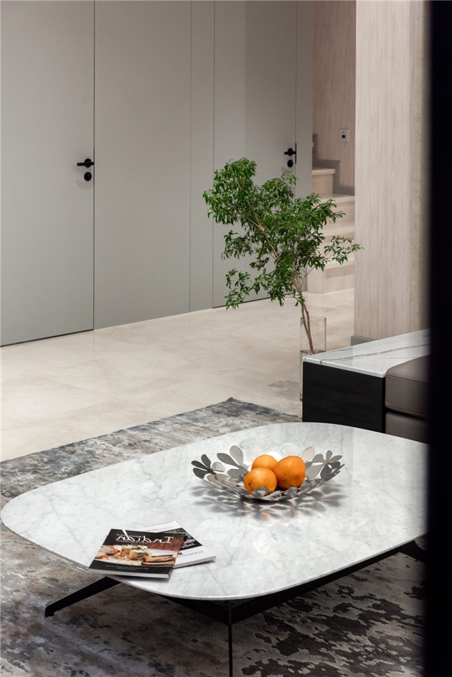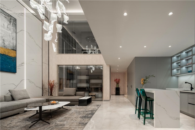 地下空间,成为居者休闲聚会的理想之地。周逸权运用“垂直光幕”的设计理念,以自然采光结合巧妙的灯光设计,营造出舒适惬意且低调奢华的质感。挑空客厅成为情感汇聚的温馨场所,意式的灰色沙发与大理石背景墙,以简约设计手法,在多种材质的碰撞中展现出独特的立体美感。