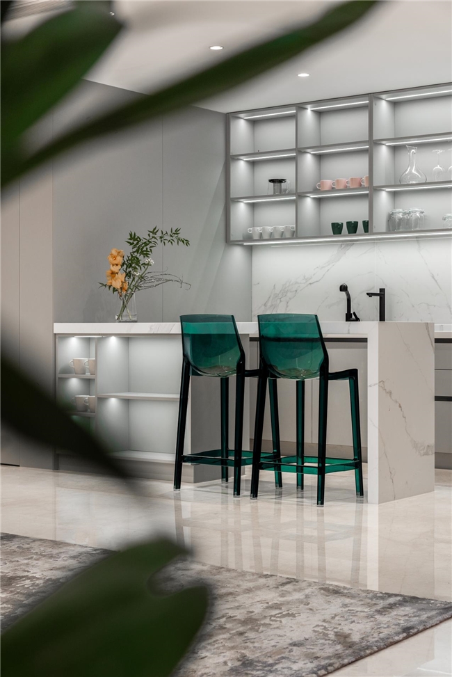 开放式社交厨房配置岩板岛台与皮革餐椅,西班牙老矿大理石的鎏金肌理,与整体的灰色调和谐相融,让厨房、岛台、餐桌的生活动线流畅自然,奏响生活的美妙乐章。