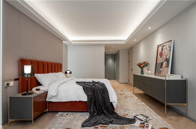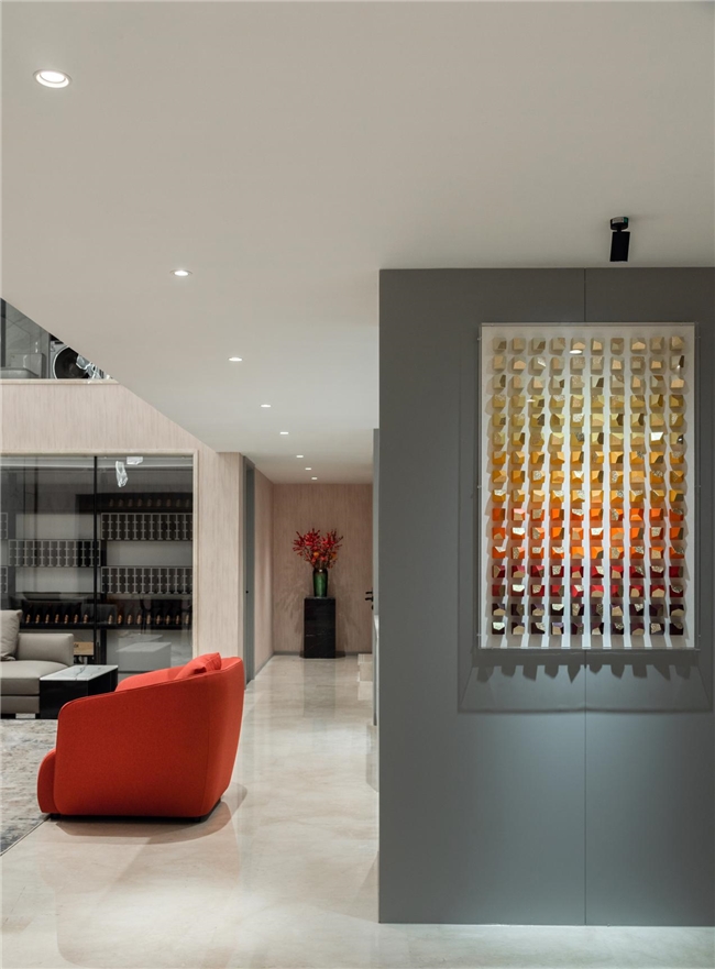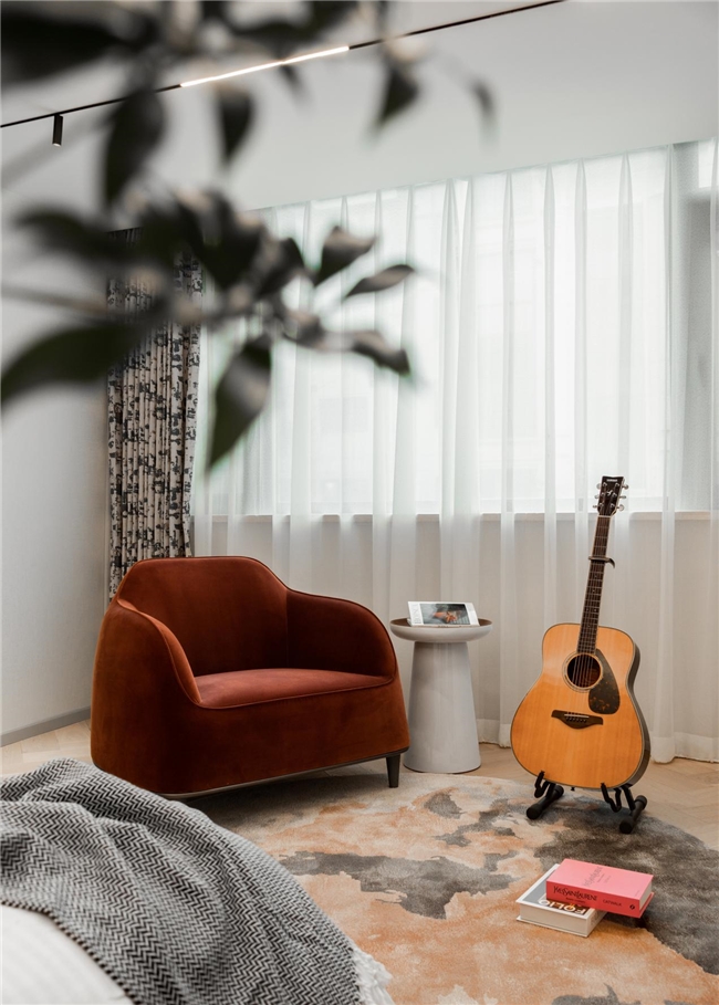 当立体抽象艺术画作撞入高级灰场域,立体主义的明艳笔触刺破高级灰的冷感,让每次归家都是一次艺术的体验,从都市喧嚣到私人场域的无声转换。 设计师周逸权撷取高饱和度的橙红元素,从艺术画作、单人沙发到空间尽头的花艺,由远及近为淡雅空间注入丰盈气息。 休憩区域,心灵栖息之所
