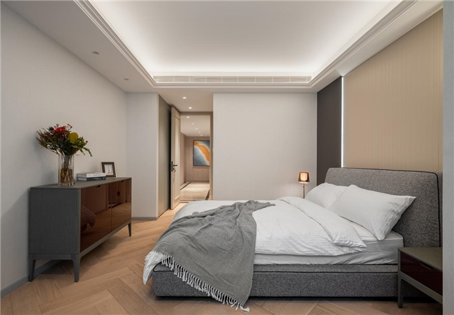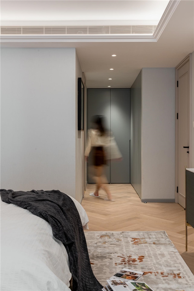 次卧在设计师周逸权的现代简洁的笔触之下,展开灰色与木色调的对话,构筑“物我相融”的休眠场域——此处静谧非真空,而是生活呼吸的显影。